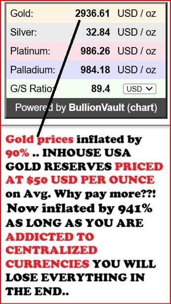 Gold prices have been inflated by 941% .. IN HOUSE USA GOLD RESERVES PRICED AT $50 USD PER OUNCE on Avg. Why pay more??! AS LONG AS YOU ARE ADDICTED TO . You are under the thumb of and AGGRESSIVE VOLATILE .