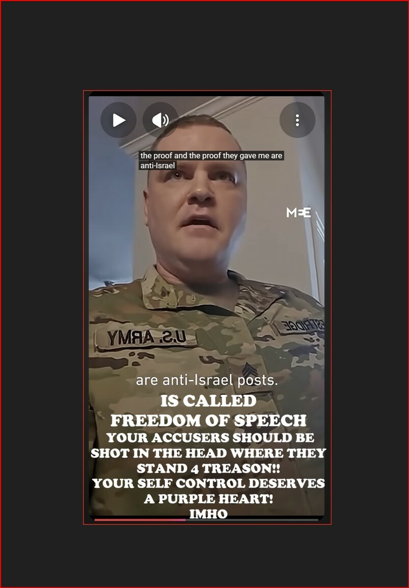 US Army Sergeant Jonathan Estridge, a 20-year military veteran, says he is under investigation for sharing anti-Israel posts on social media.