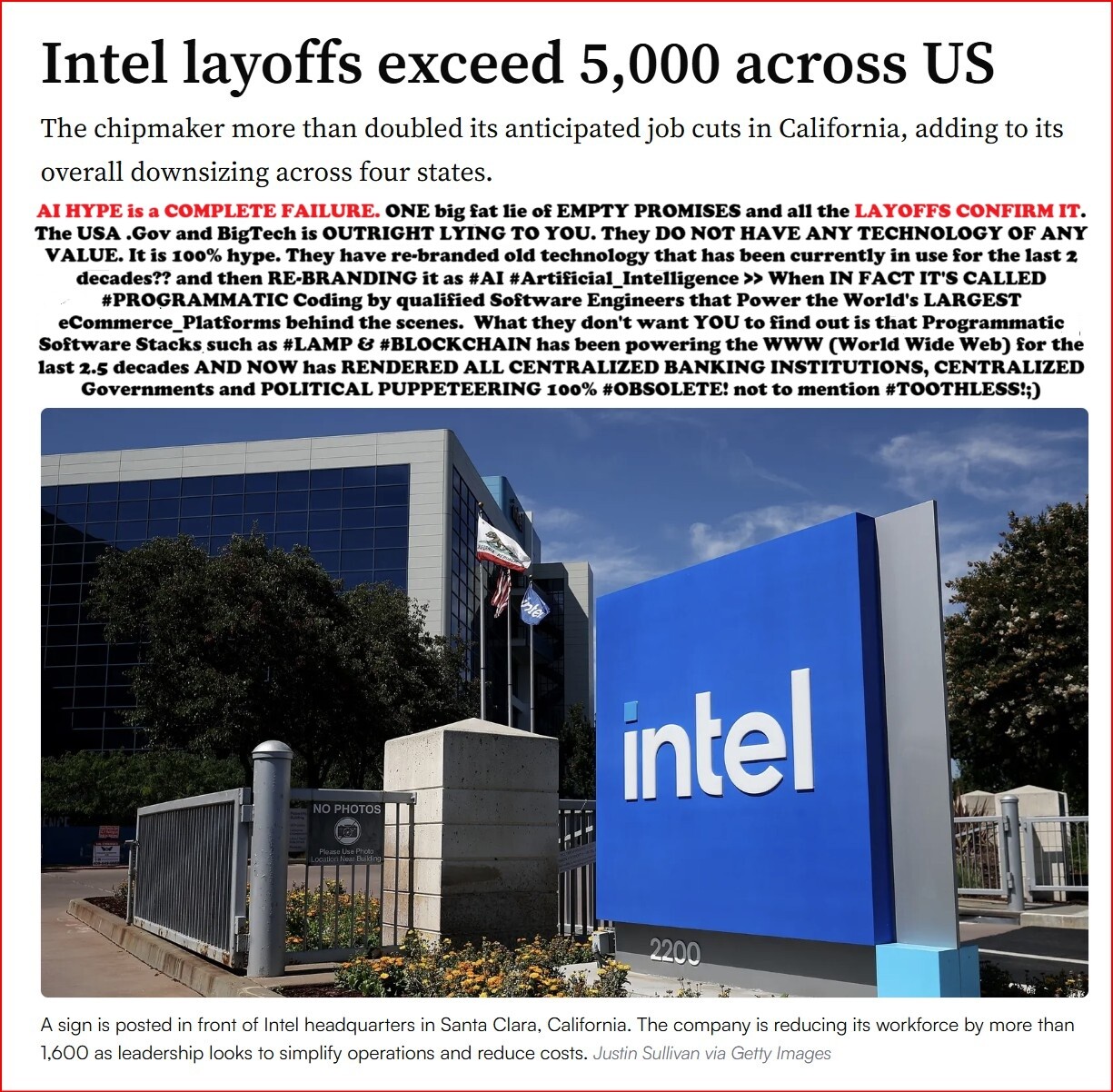 AI HYPE is a COMPLETE FAILURE. ONE big fat lie of EMPTY PROMISES and all the LAYOFFS CONFIRM IT. The USA Gov and Bigtech is OUTRIGHT LYING TO YOU. They DO NOT HAVE ANY TECHNOLGY OF ANY VALUE. It is 100% hype. The have rebranded old technology that has been currently in use for the last 2 decades calling it AI when all it is rebranded PROGRAMMIC Code. What they don't want to find out that #LAMP & #BLOCKCHAIN POWERS THE WORLD AND RENDERS ALL CENTRALIZED BANKING INSTITUTIONS AND CENTRALIZED GOVERNMENT #OBSOLETE!