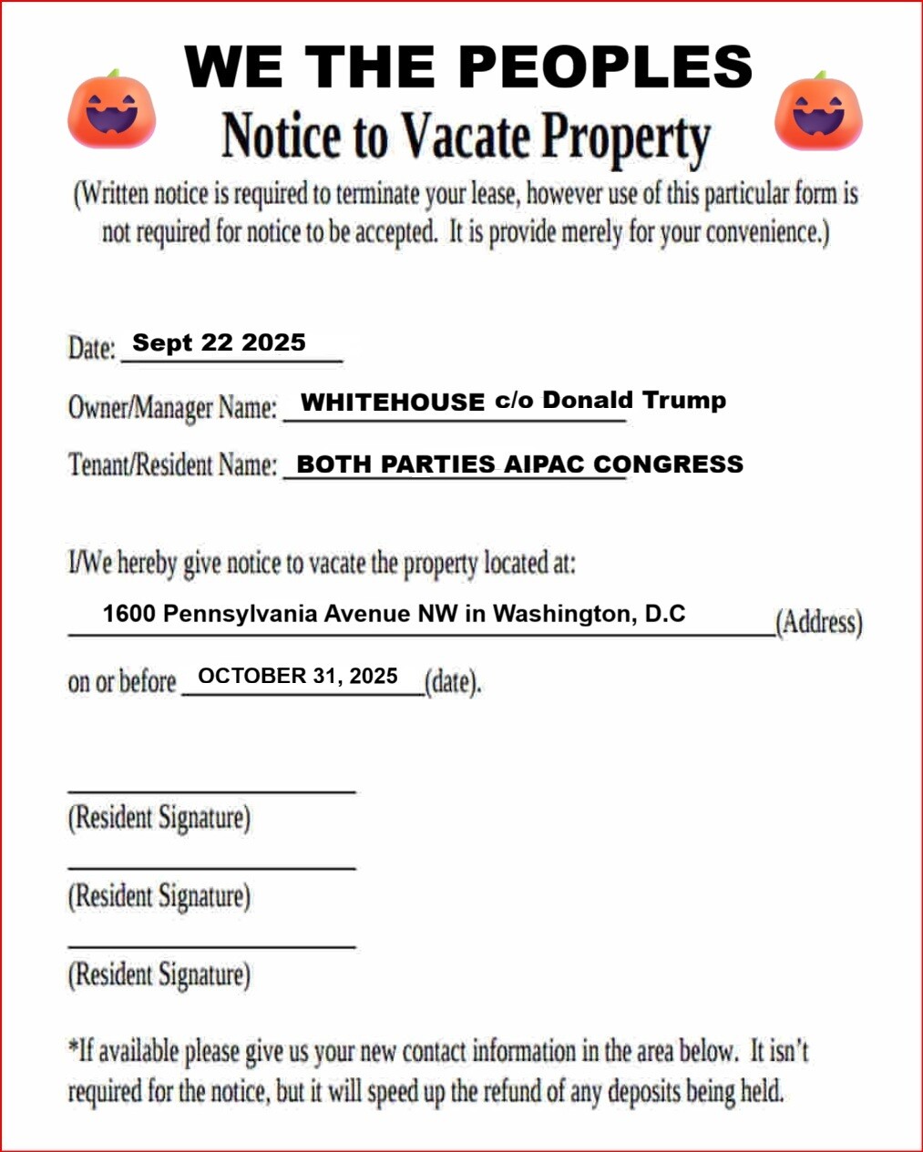 🏦 #WHITEHOUSE 11 DAY #EVICTION #NOTICED SERVED BY WE THE PEOPLE ON SEPT 22, 2025 🎃 🎃 🎃