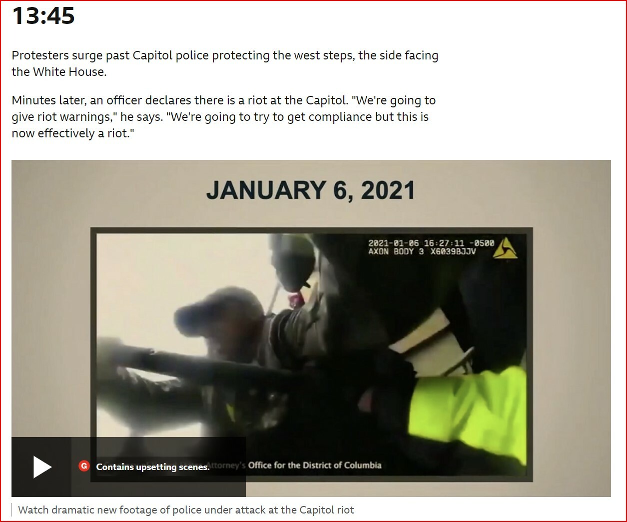 Minutes later, an officer declares there is a riot at the Capitol. "We're going to give riot warnings," he says. "We're going to try to get compliance but this is now effectively a riot."